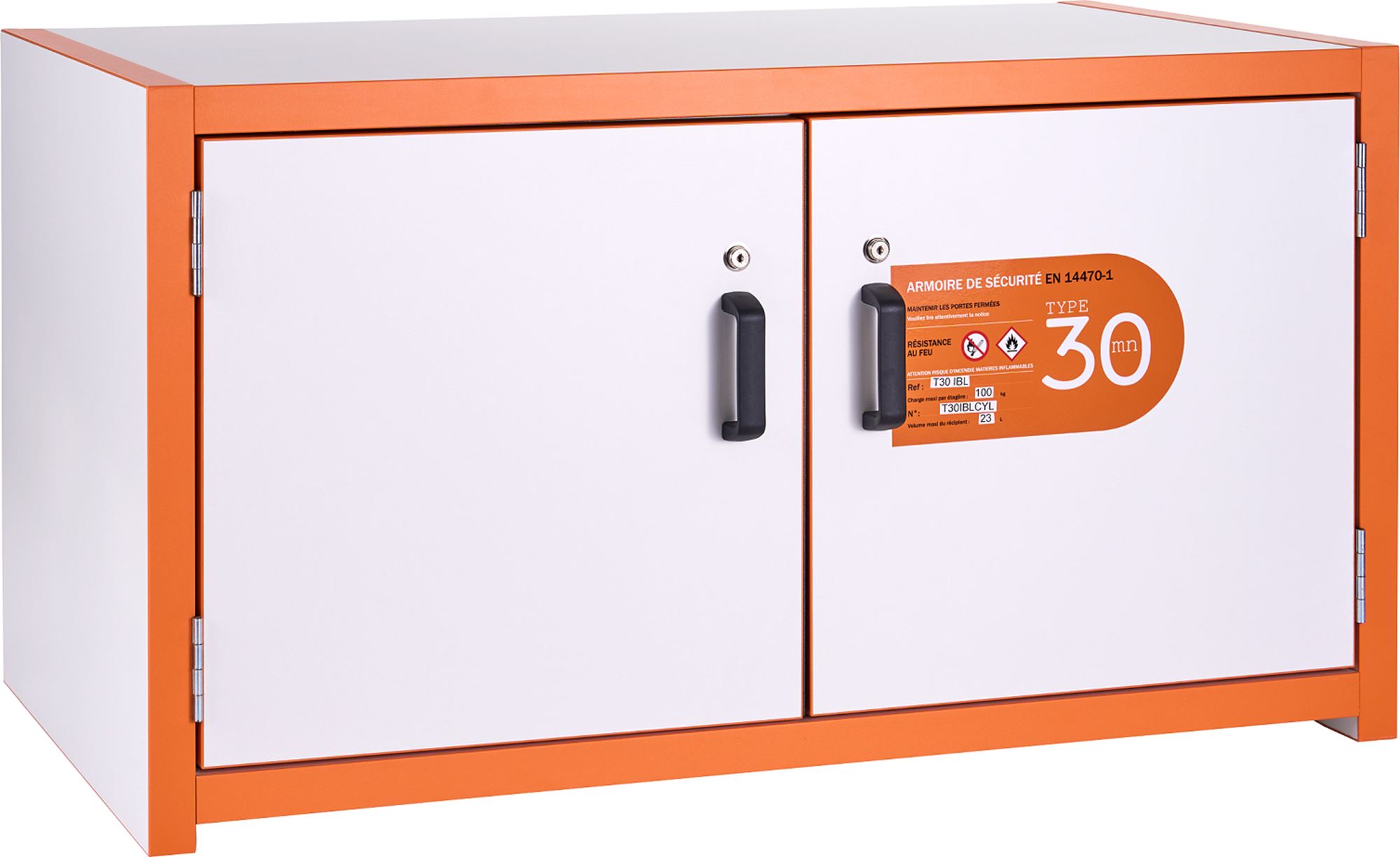 Petit modèle d'armoire de sécurité T30 IBL Voussert avec 2 portes. Fabriquée en France, est conçue pour le stockage de produits dangereux en toute sécurité, conformément à la norme NF EN 14470-1 1.