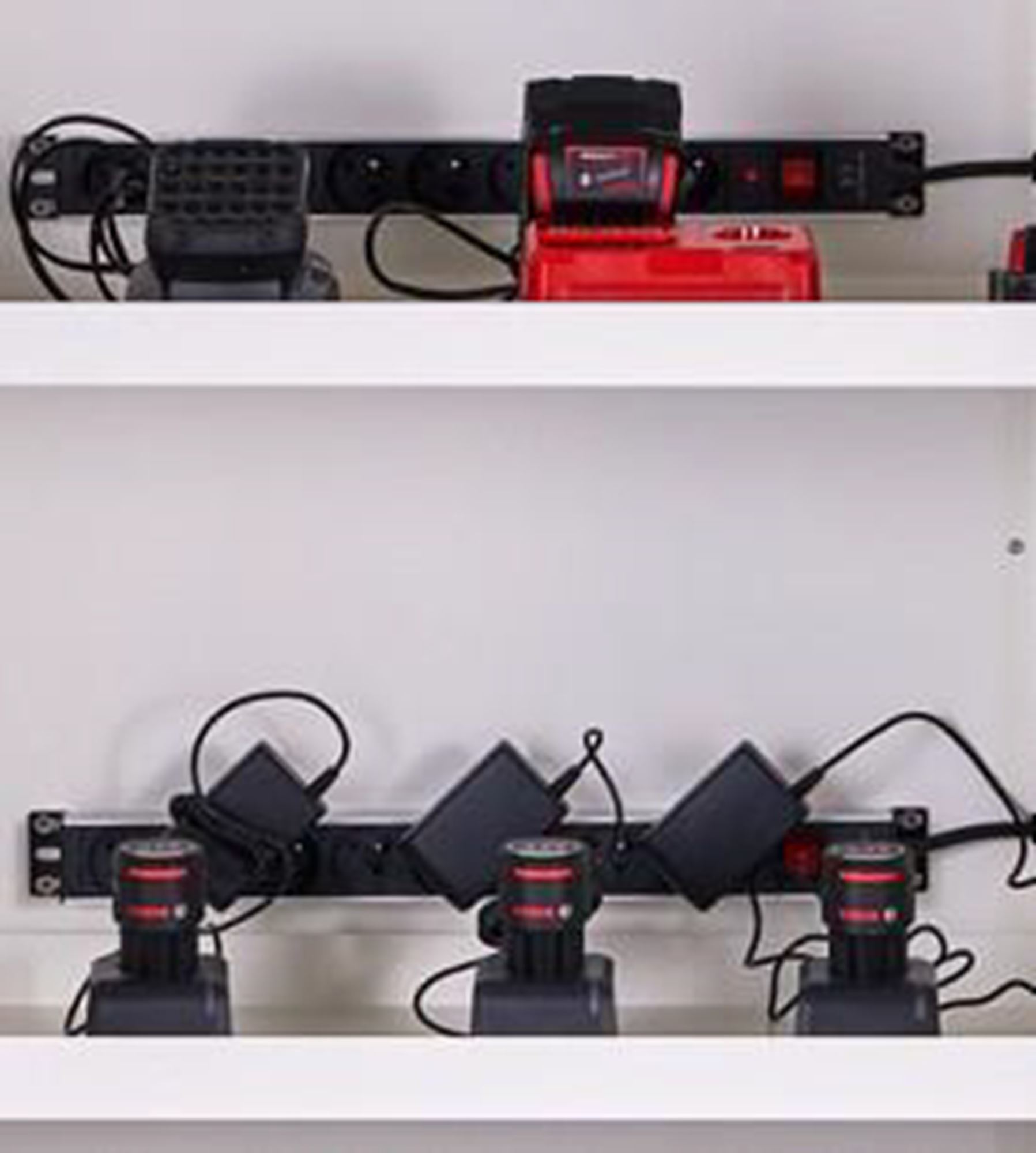 L'intérieur dispose de trois étagères réglables équipées de bandeaux de prises avec disjoncteurs pour prévenir les risques électriques.