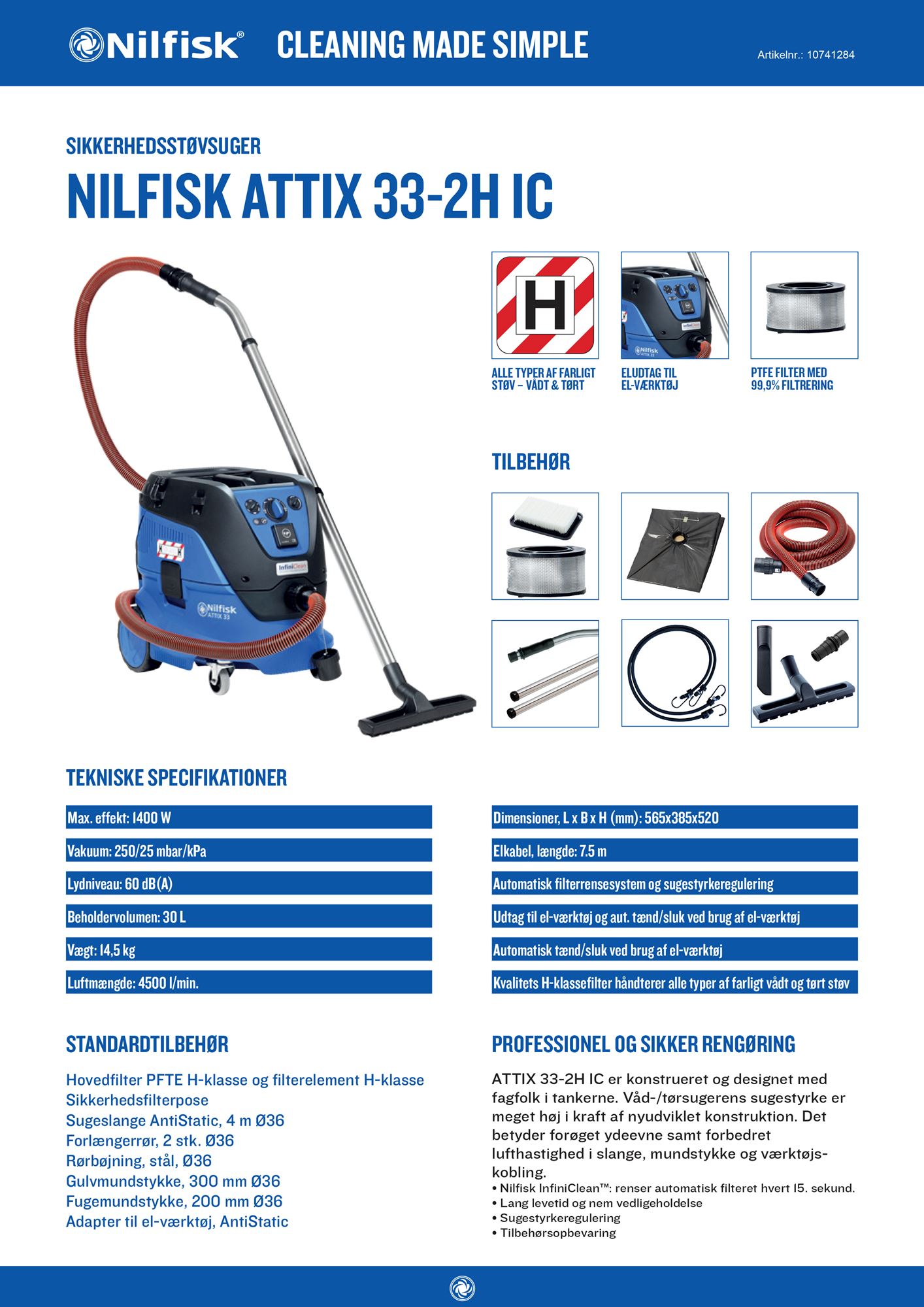 Nilfisk Attix 33-2H I est un aspirateur à poussières dangereuses hautement nocives. L'attix 33-2H dispose d'une double filtration HEPA 13. Modèle IC InfiniClean qui est un système de décolmatage automatique de filtre.