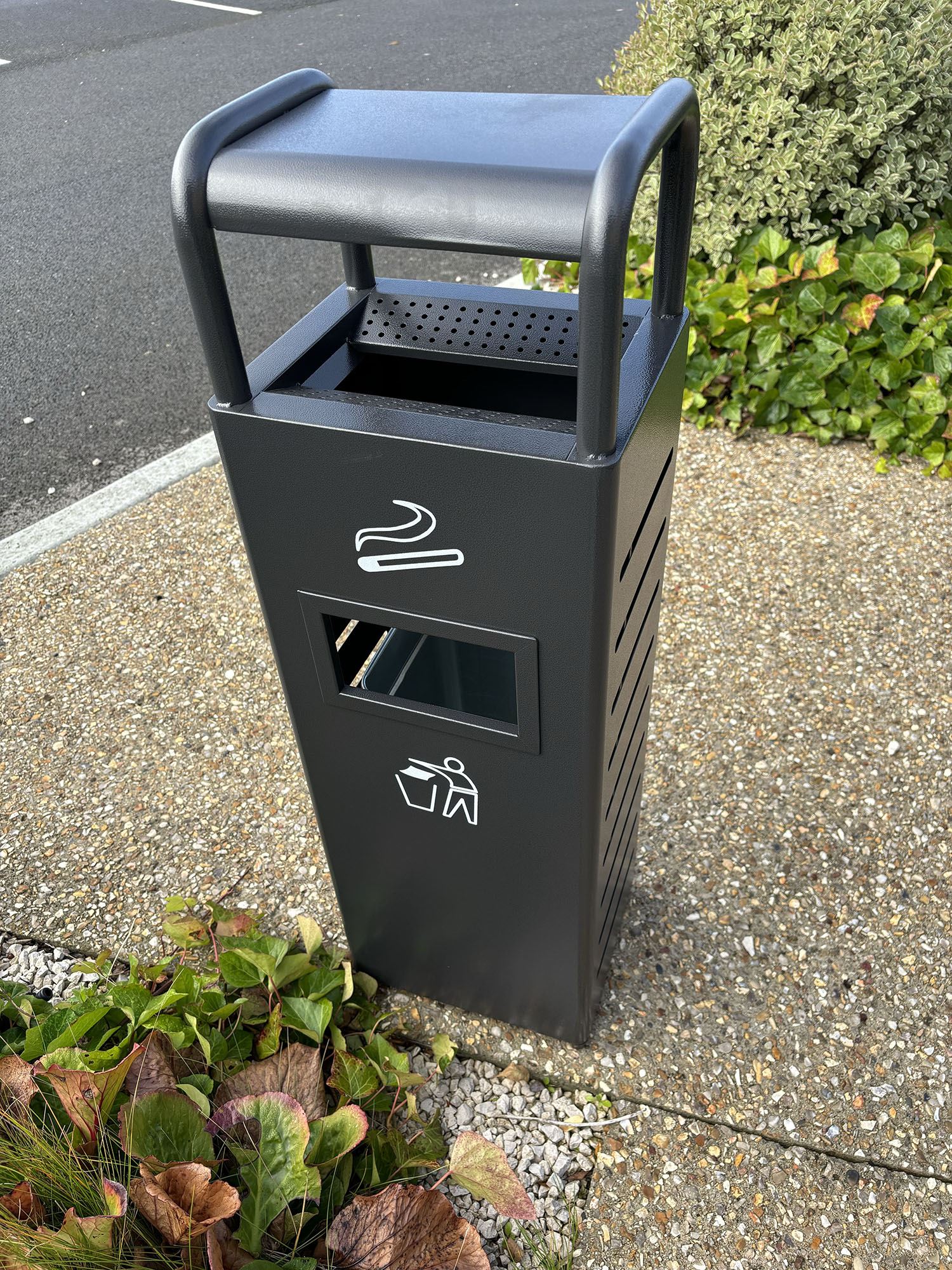 Idéal pour les espaces exterieurs pour les zones fumeurs et collecte des déchets. Vous avez de grand espaces et un fort traffic ? Cette corbeille grand volume intégrant un cendrier est une solution pour les entrées de parcs, les zones commerciales, entrée de gares, entrées d'aéroport, parking de zone commerciale, l'espace public, les abords de plage, parc de loisir...etc