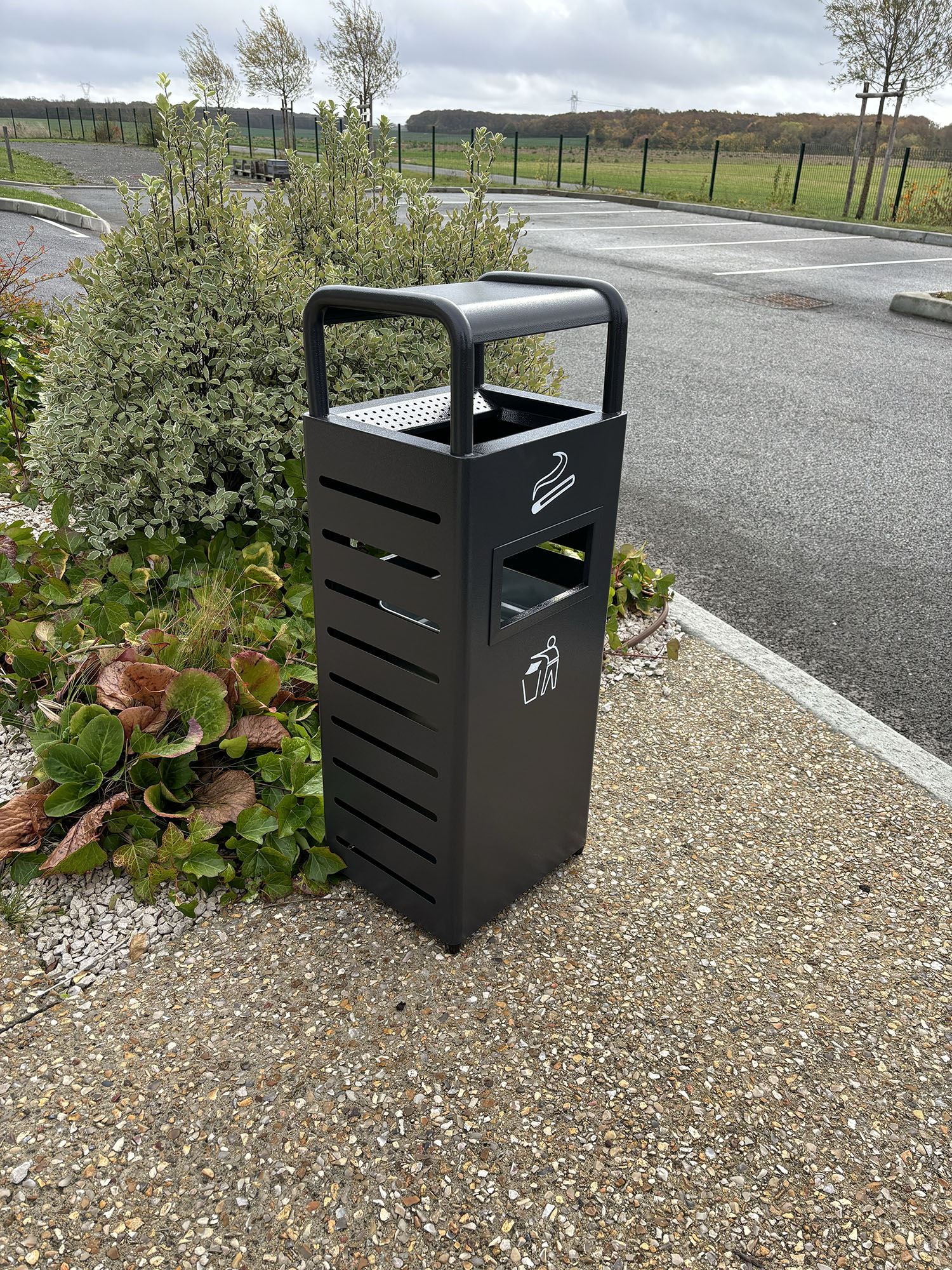 Vous avez de grand espaces et un fort traffic? Cette corbeille grand volume intégrant un cendrier est une solution pour les entrées de parcs, les zones commerciales, entrée de gares, entrées d'aéroport, parking de zone commerciale, l'espace public, les abords de plage, parc de loisir...etc