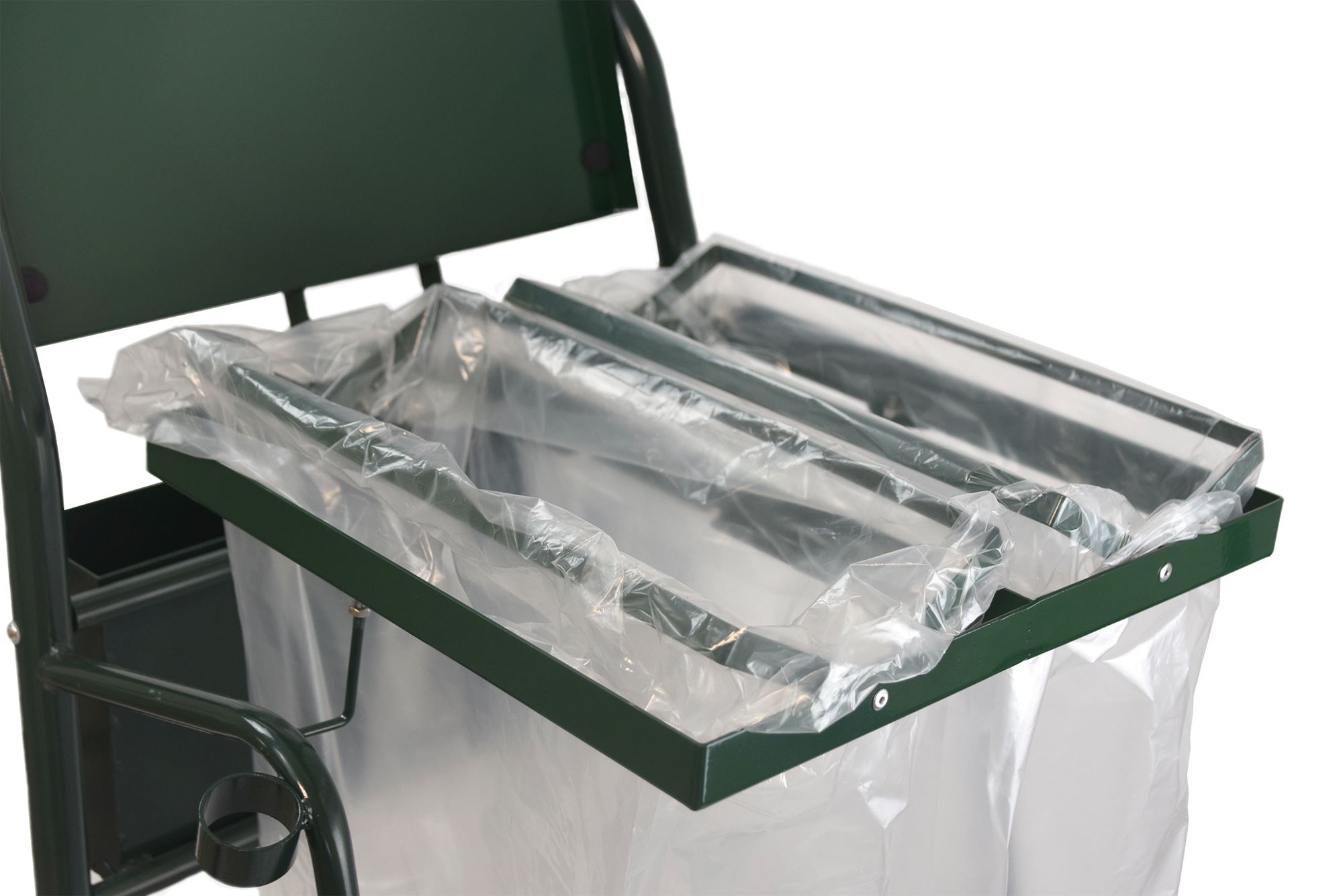 Chariot de voirie porte sac poubelle Rossignol vert est avec 2 supports sacs poubelle 2x110 litres et avec couvercle.