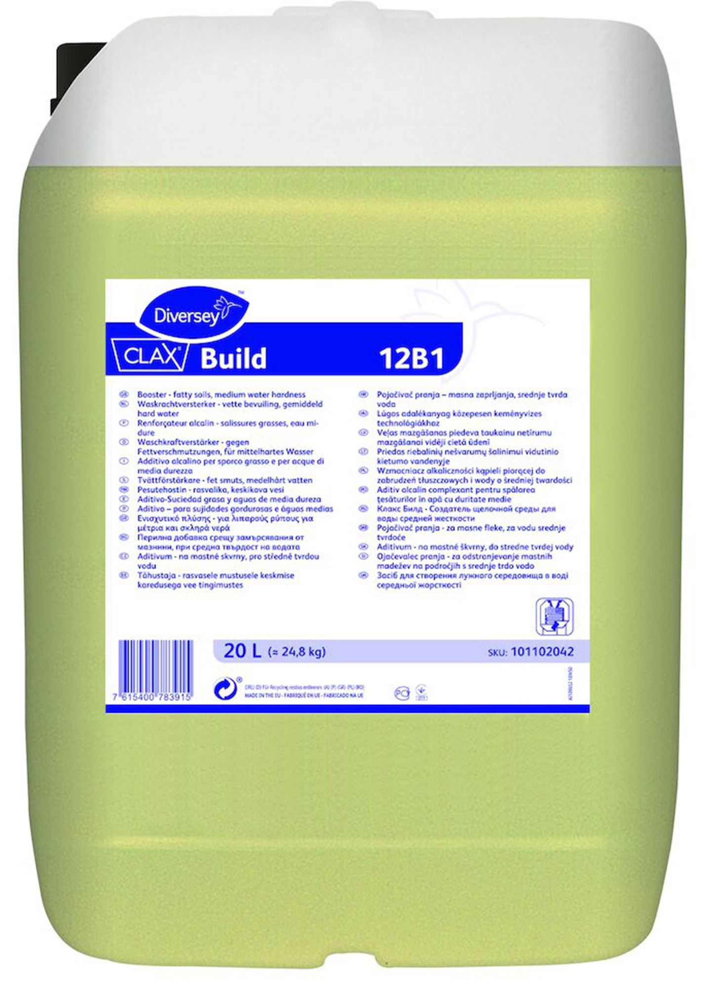 Lorsqu’il est associé à une poudre de lavage principale, Clax Build augmente le pH du bain de lavage et accentue ainsi la performance du cycle, en particulier pour le traitement du linge très souillé.