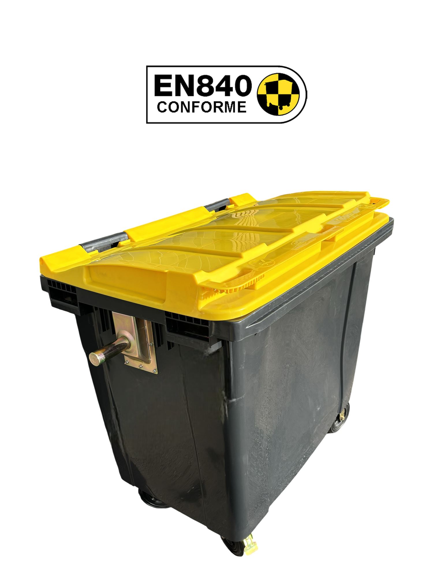Conteneur poubelle 4 roues 660 litres est en polyéthylène haute densité haute résistance. Il dispose d'une prise frontale et de tourillons latéraux en acier. Robuste. 4 roues roues dont 2 roues freinées. Modèle couvercle jaune. Norme EN840.