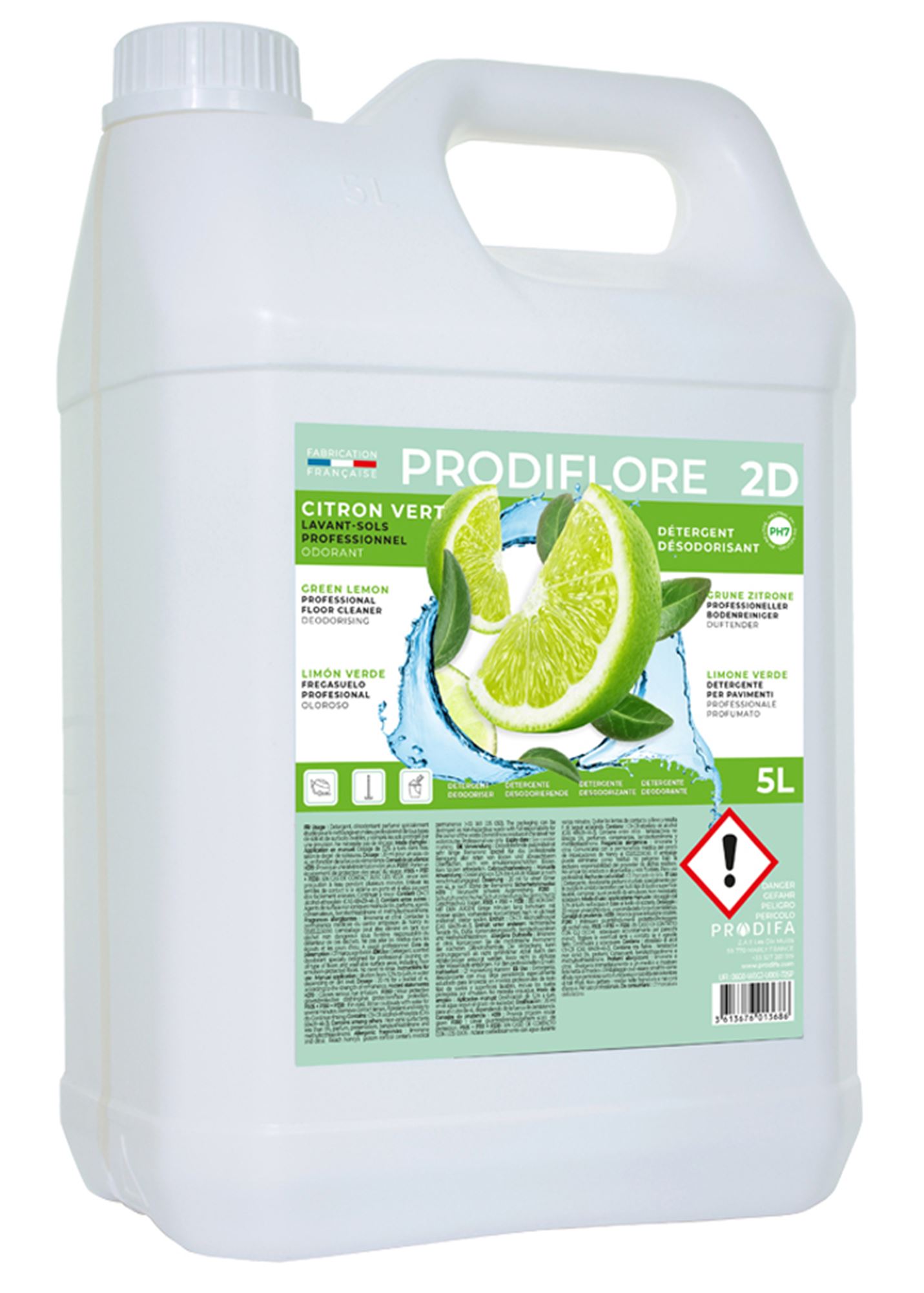 Détergent désodorisant parfum citron vert. Nettoyant pour sol et surface. pH neutre. Usage professionnel collectivités, industrie, café, hôtel, restaurant...Usage en autolaveuse ou lavage à plat. Parfum longue rémanence. Bidon de 5 litres.