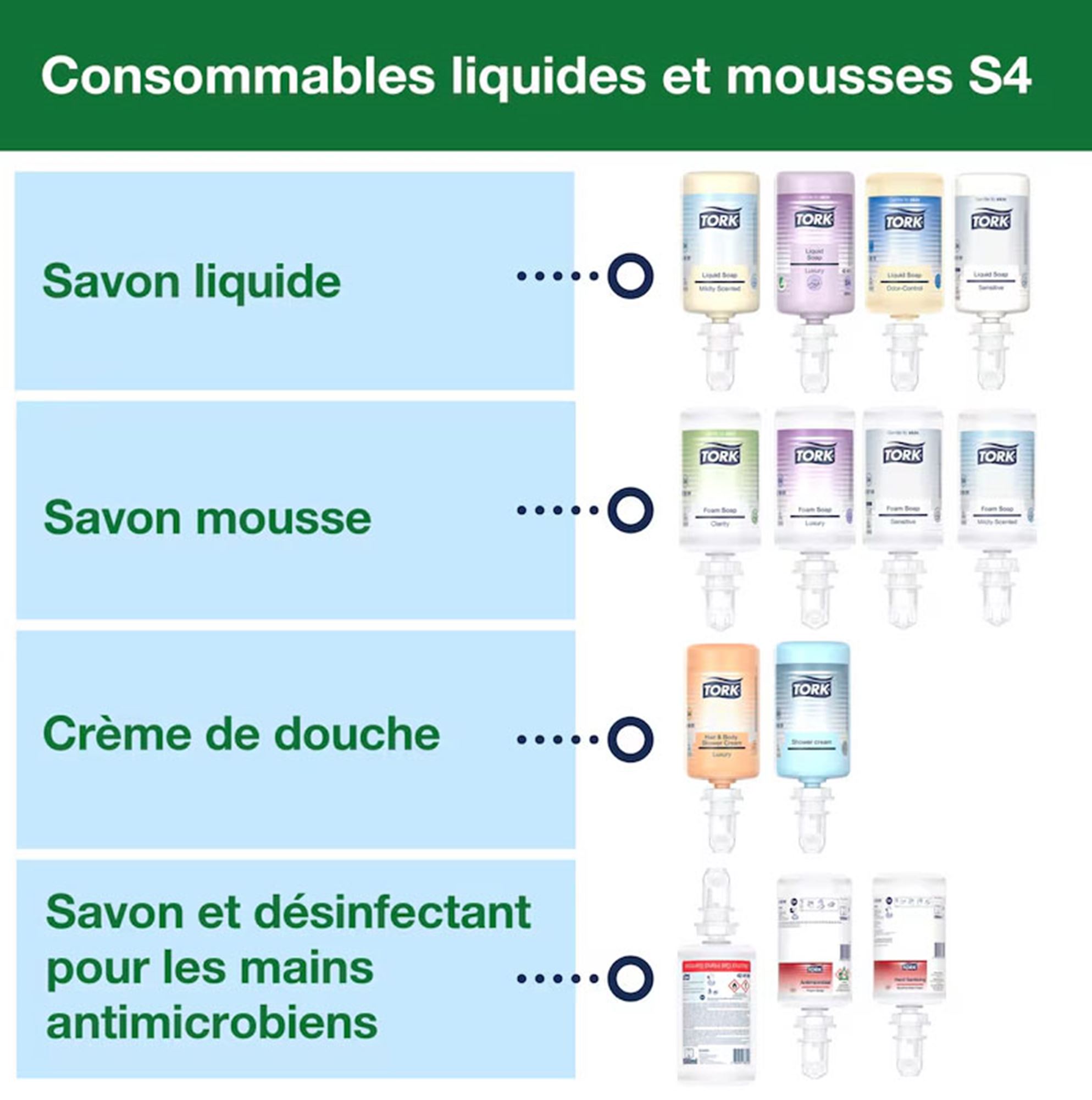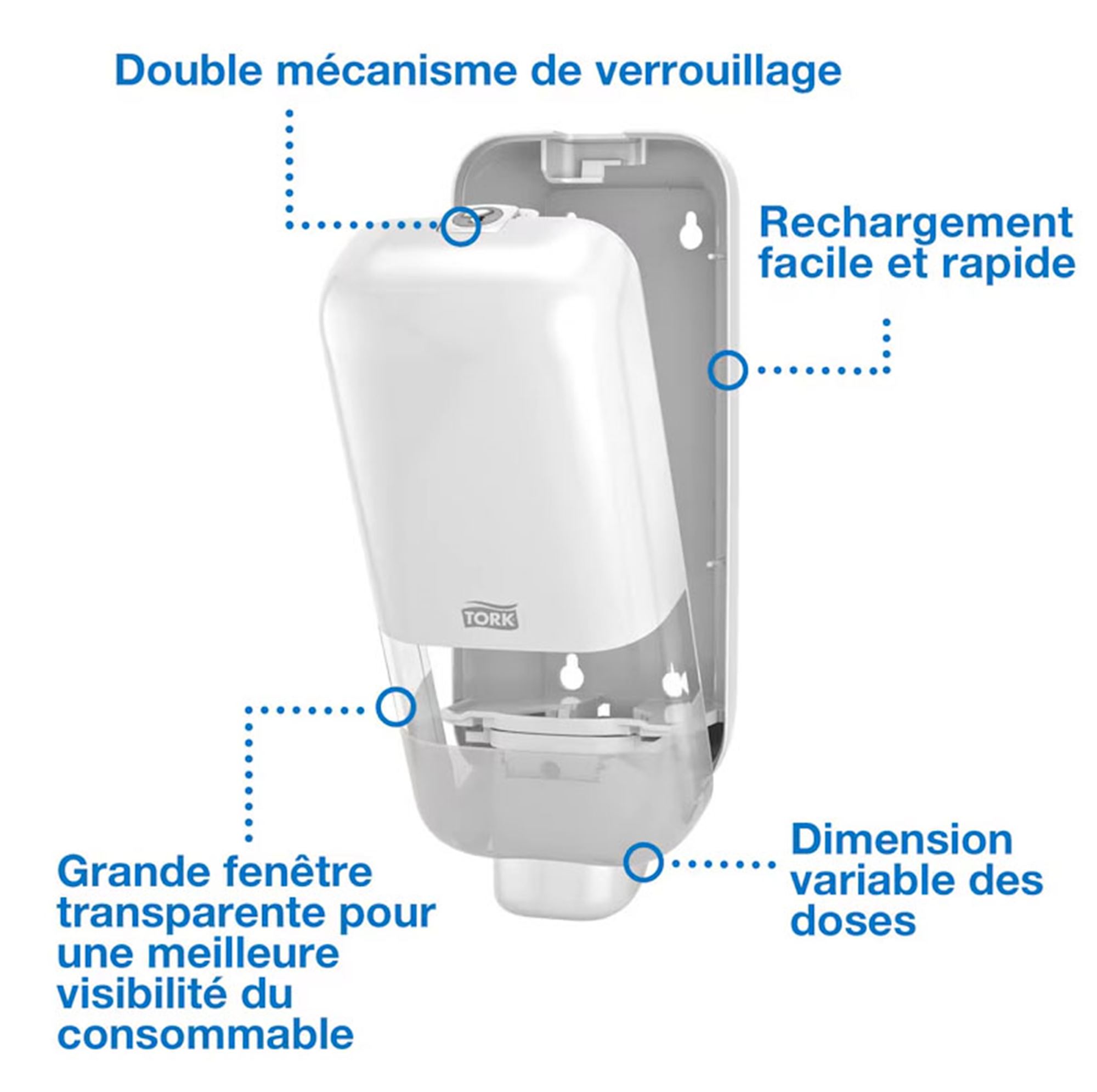 - Polyvalence maximale : compatible avec plusieurs types de savons et désinfectants Tork (mousse, liquide, gel).