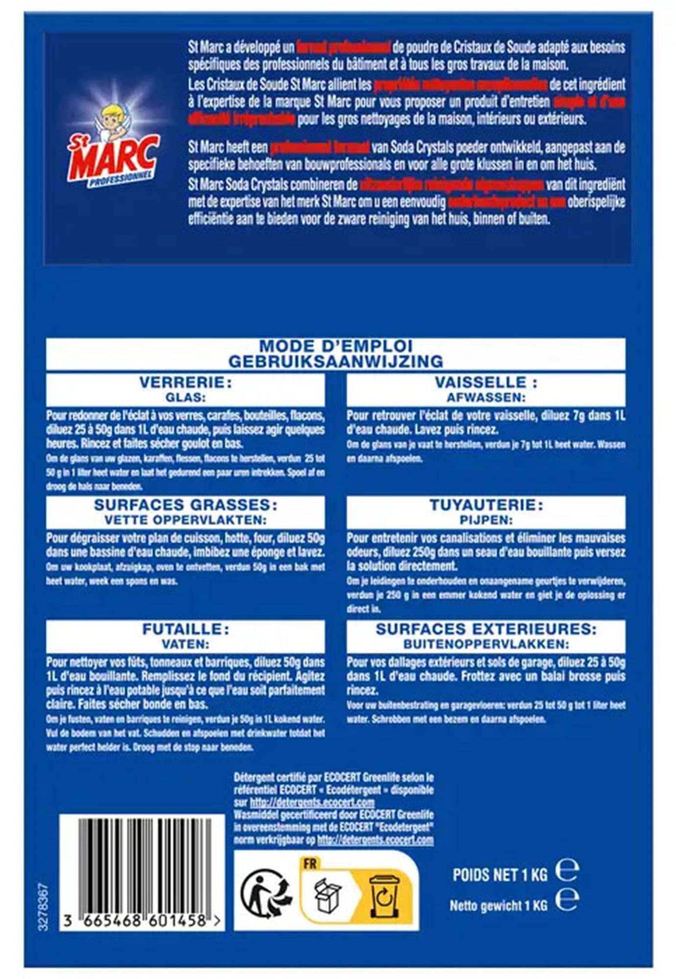 Saint Marc cristaux de soude lessive gros travaux est un nettoyant simple et économique. Avec la lessive Saint Marc vous pourrez dégraisser des surfaces, entretenir vos évacuations et redonner de l'éclat aux surfaces nettoyées.