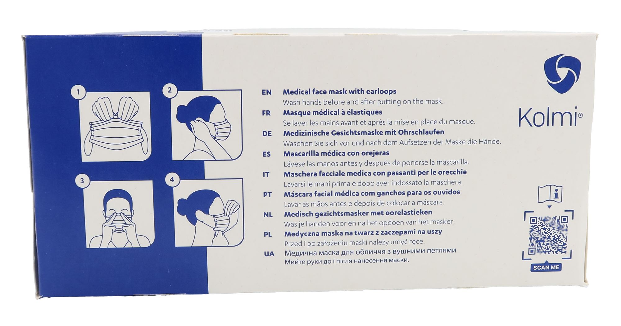 Masque chirurgical fabriqué en France par Kolmi. Masque 3 plis en14683 type II.