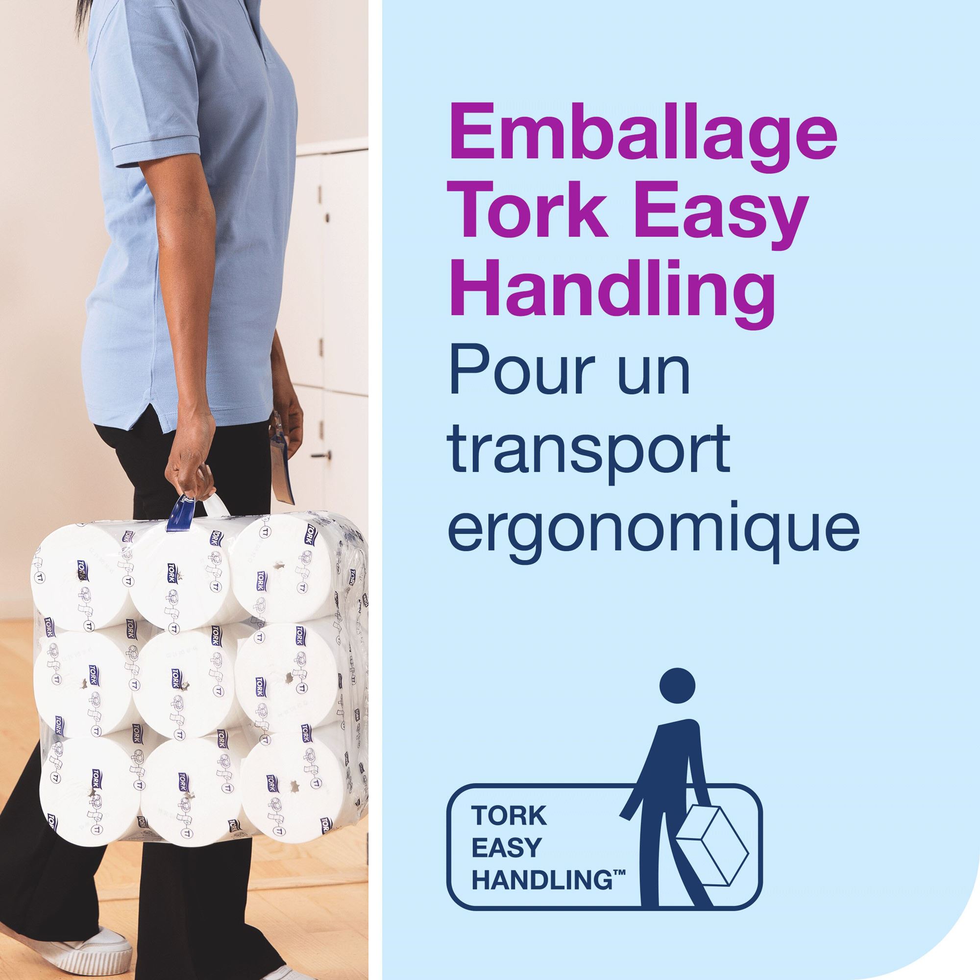 Transport et manipulation facilités: Conditionné avec le système Tork Easy Handling®, il offre une solution ergonomique et pratique pour le transport et la gestion des recharges.