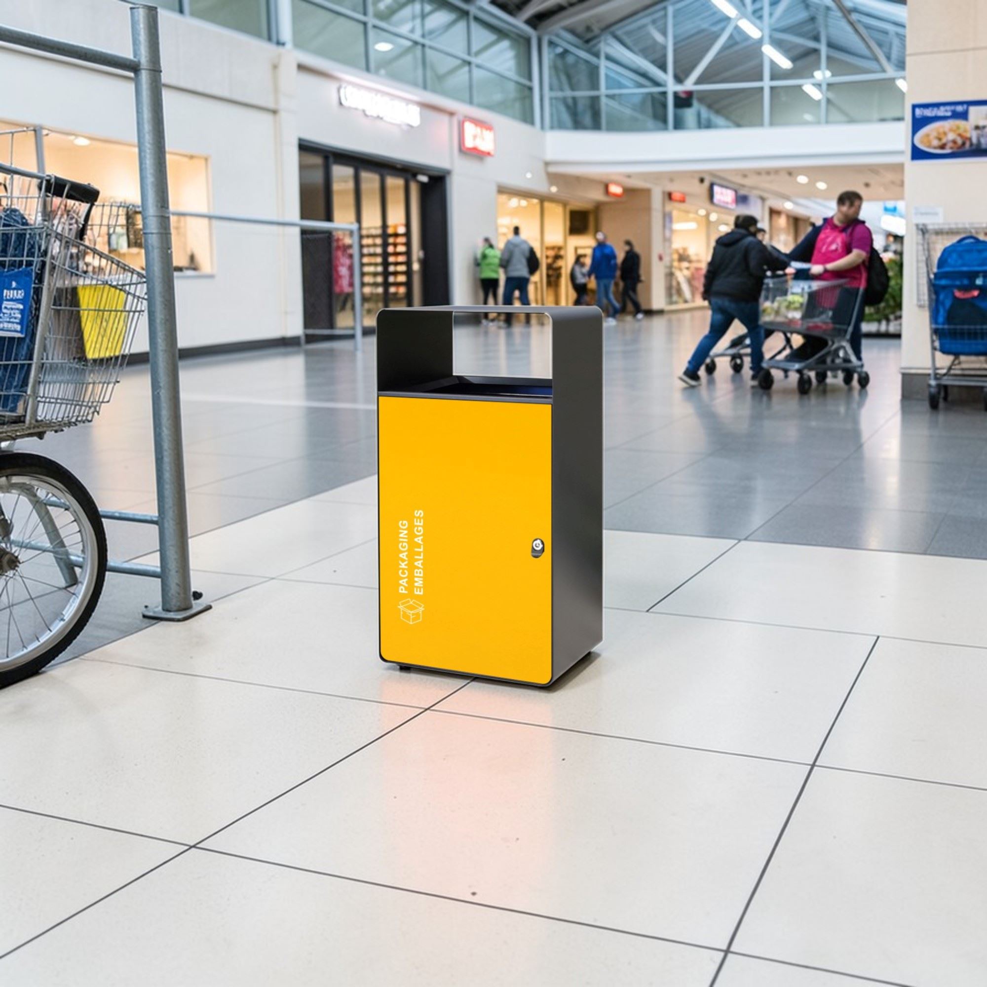 Poubelle de tri emballage jaune cube 67L. Usage intérieur ou extérieur. Acier galvanisé. Fermeture à clef. Bac intérieur 67L utile. Signalétique Français et Anglais emballage. Fixation au sol possible.