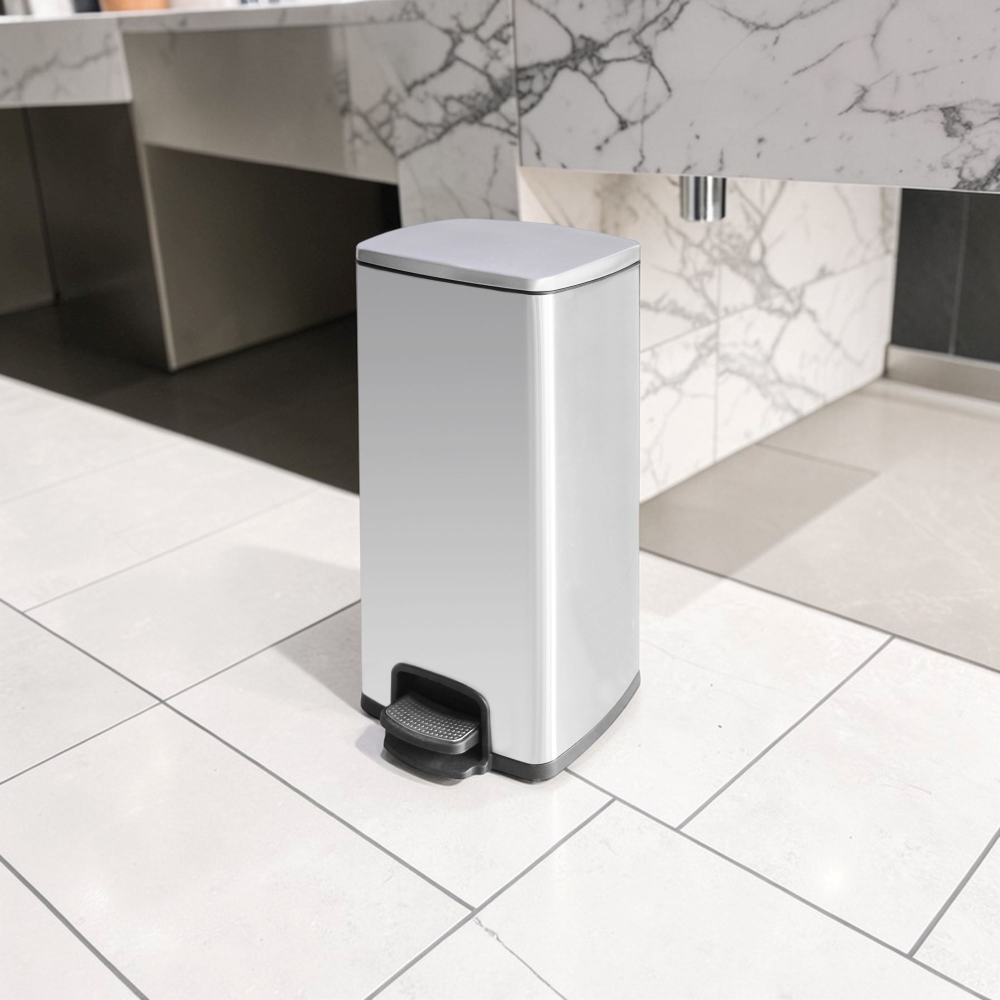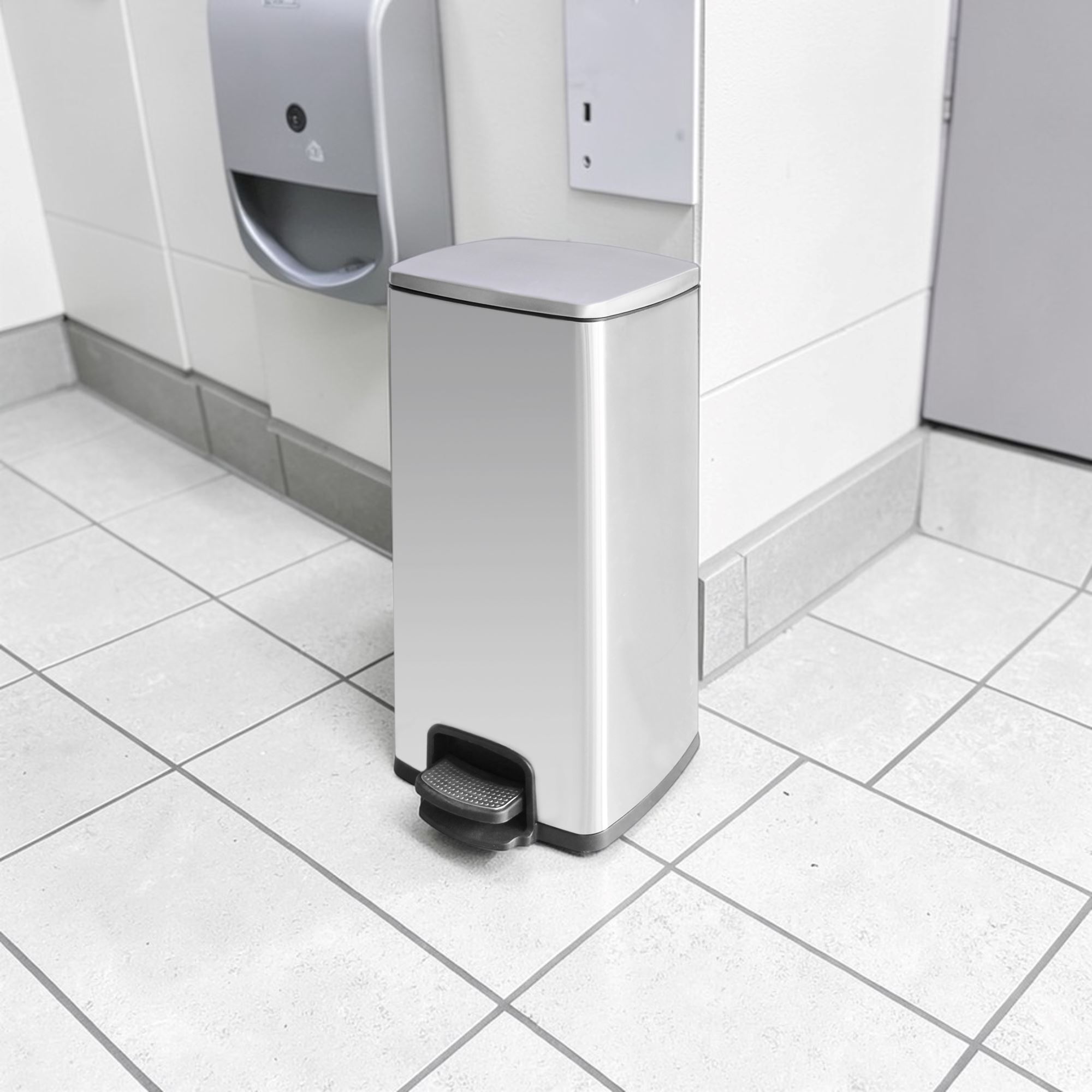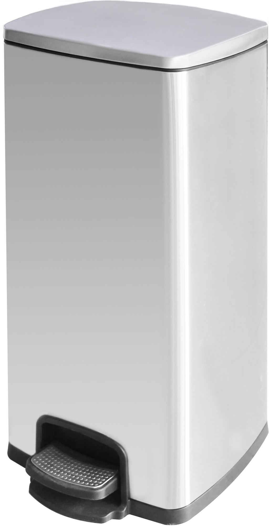 Poubelle inox design 30L à pédale. Forme rectangulaire. Coloris argent en acier inoxydable. Idéal pour hôtel, aéroport, gare, bureau, sanitaires.