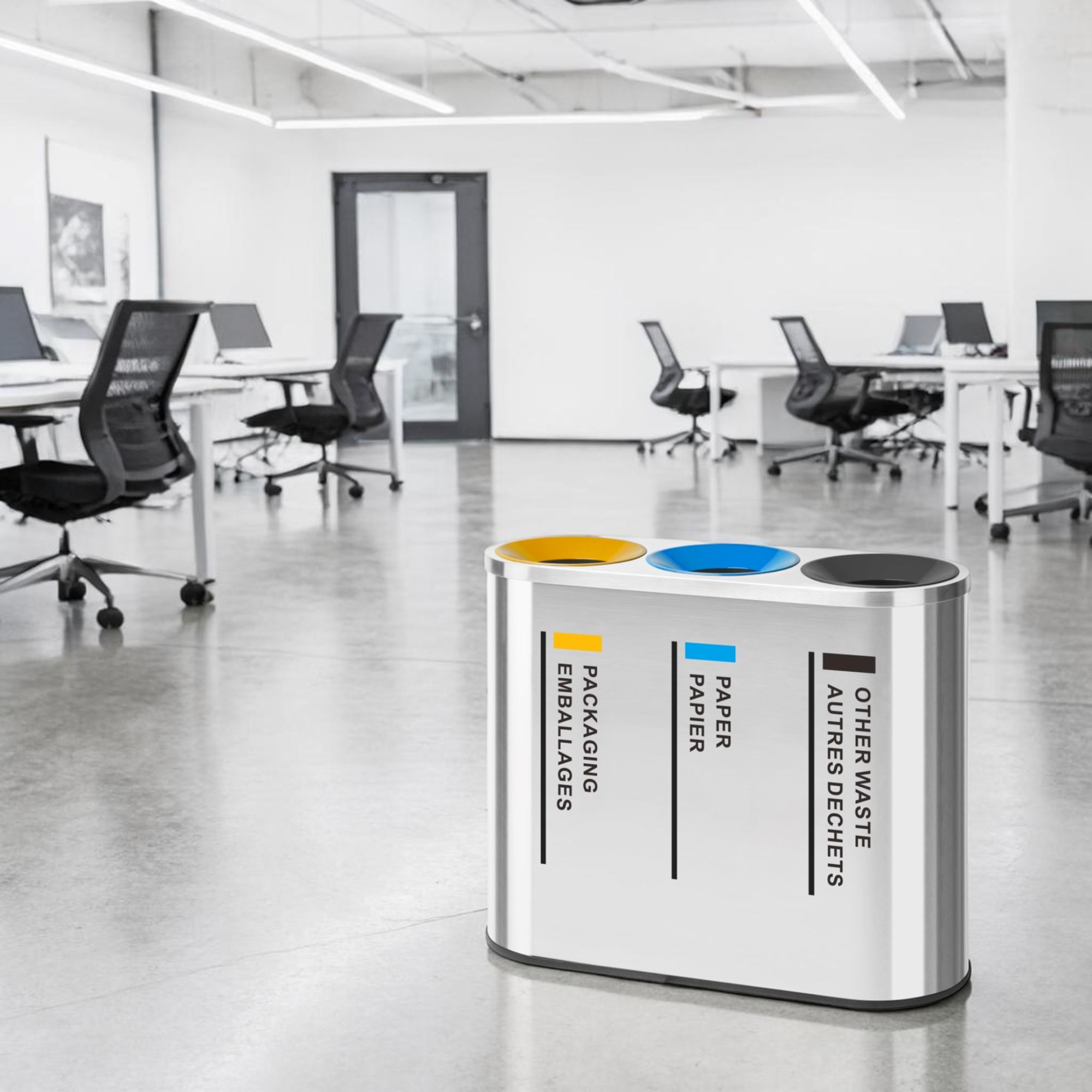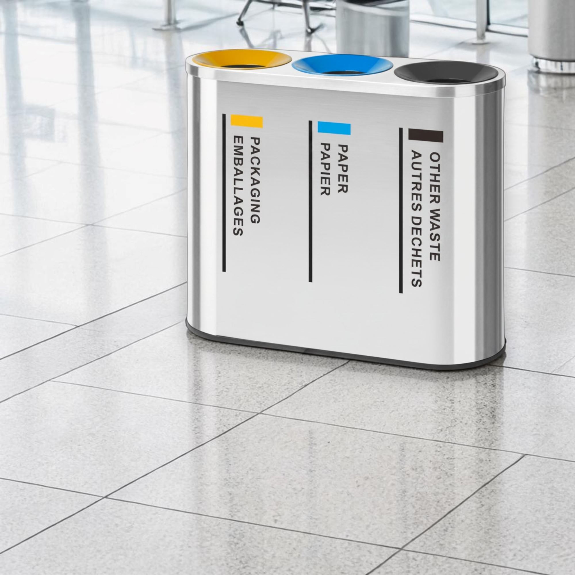 Poubelle tri sélectif inox 3 flux pour intérieur. Idéal aéroport, bureau, open space, collectivité, hôtel, hôpitaux. Seau intérieur en acier galvanisé 42L