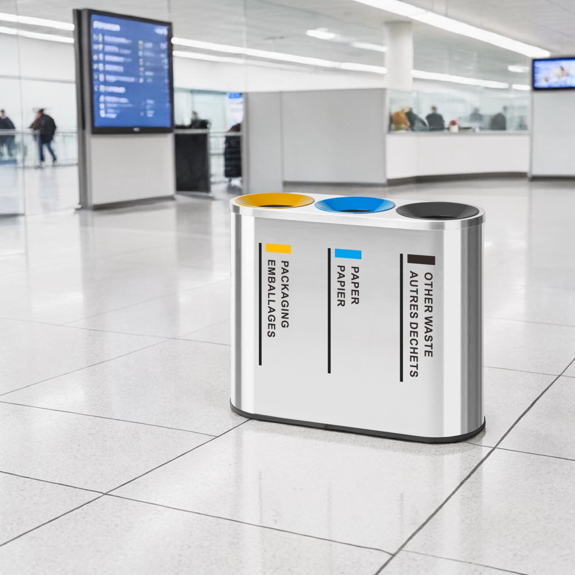 Poubelle tri sélectif inox 3 flux pour intérieur. Finition tout inox avec seau intérieur en acier galvanisé. Conçu pour l'intérieur et sera idéal aéroport, bureau, open space, collectivité, hôtel, hôpitaux, centre commerciaux...