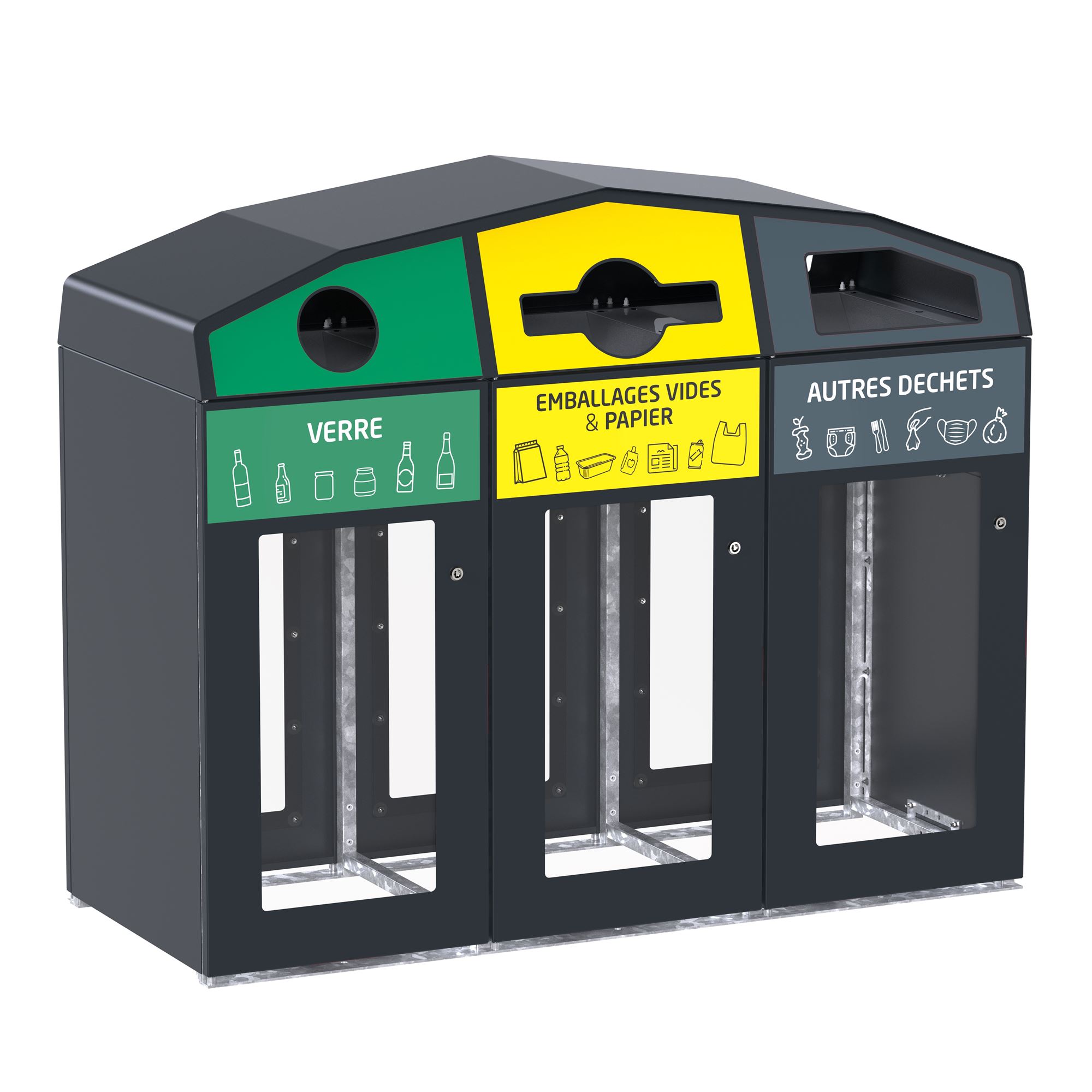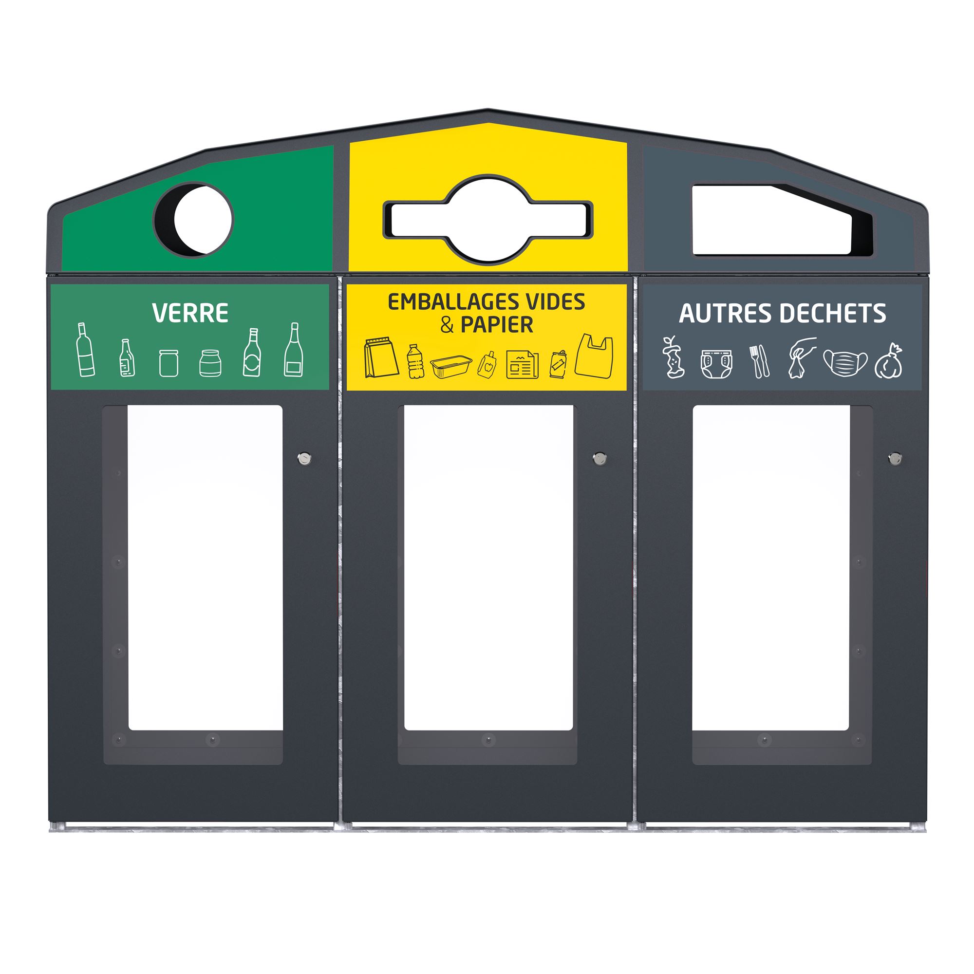 Conçue pour les espaces publics soumis aux exigences Vigipirate, cette station de tri 3 flux permet une visualisation rapide du contenu tout en facilitant la séparation des déchets grâce à des ouvertures adaptées et une signalétique claire.