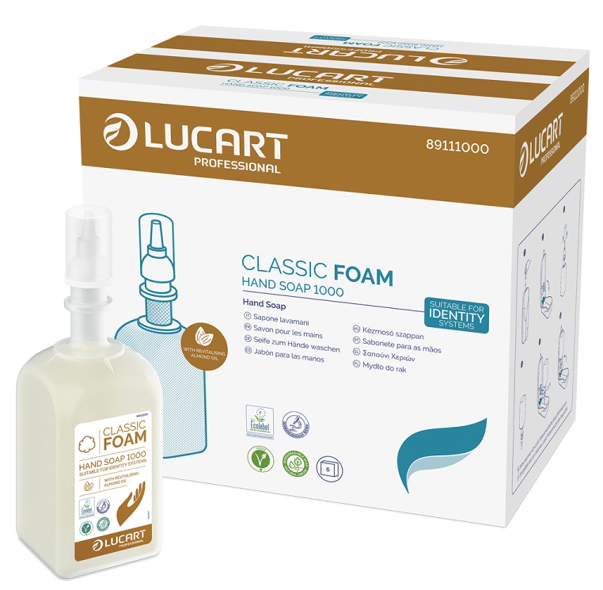 Le savon mousse Classic est une recharge compatible avec les distributeurs Identity Soap 1000 892439 et 892440 de la gamme Identity de Lucart Professional, une solution complète alliant hygiène, design et durabilité pour les environnements professionnels.