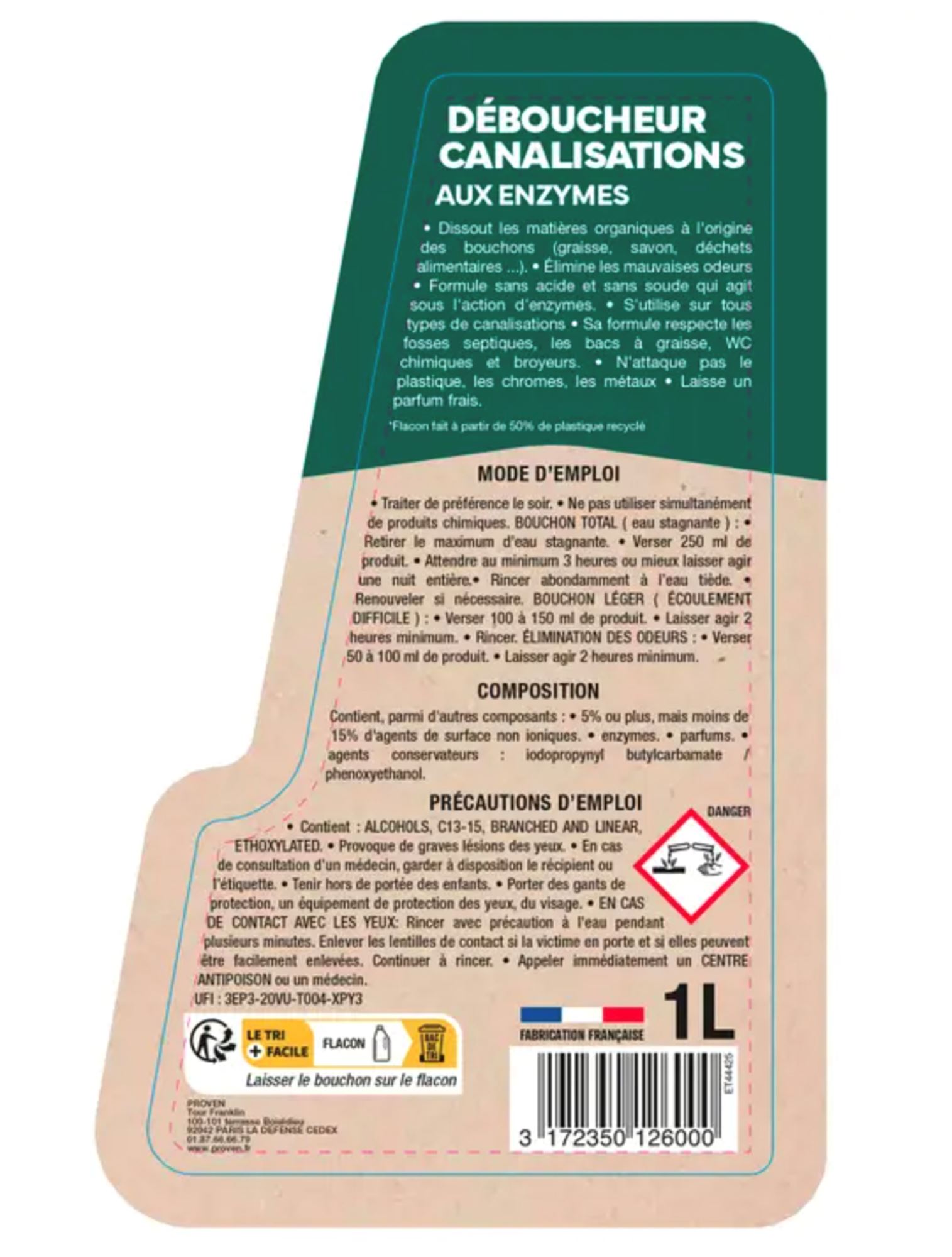 - Polyvalent et économique — Un seul produit pour trois usages (débouchage, entretien, désodorisation) avec des doses adaptées de 50 ml à 250 ml selon le besoin.