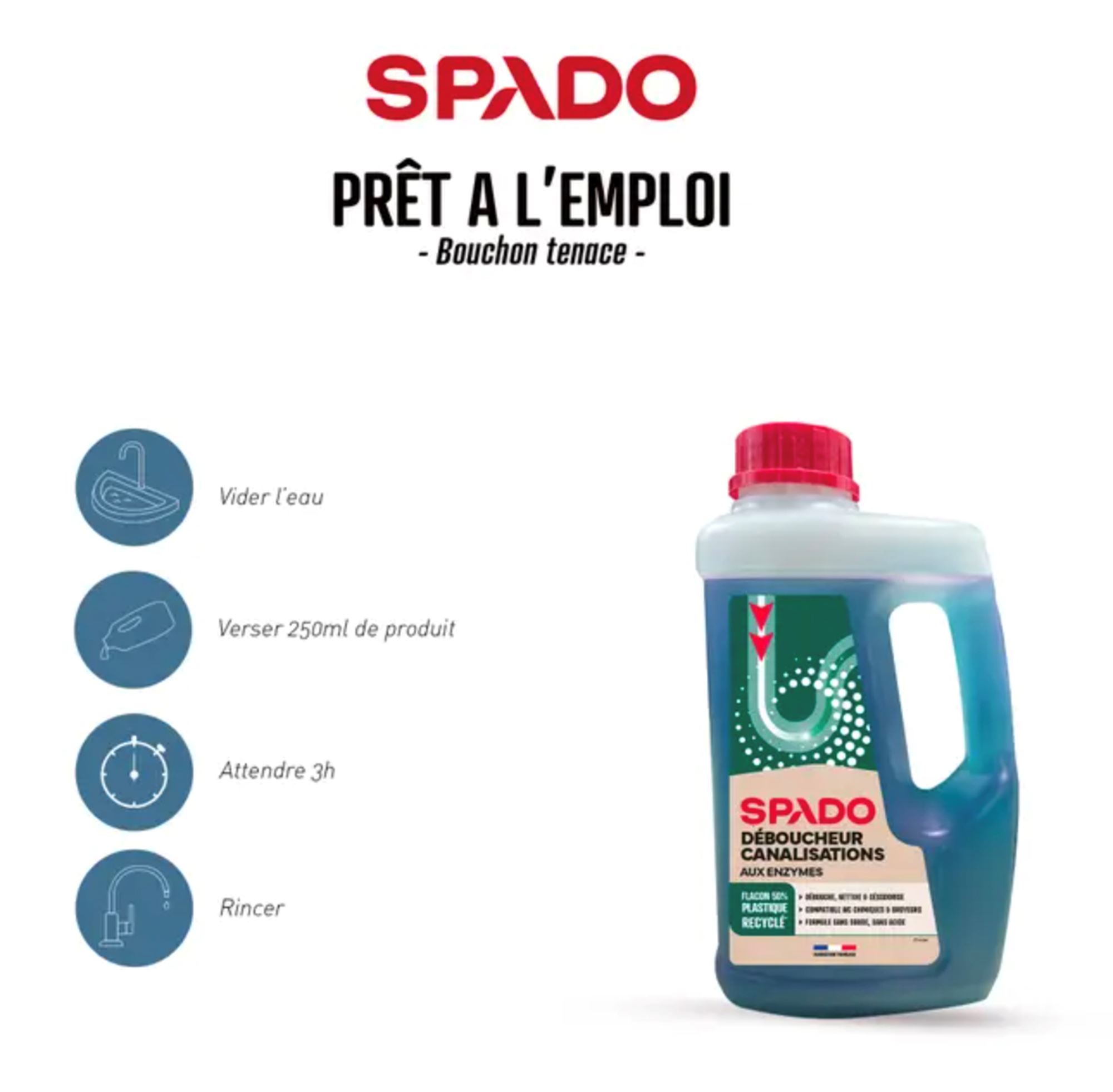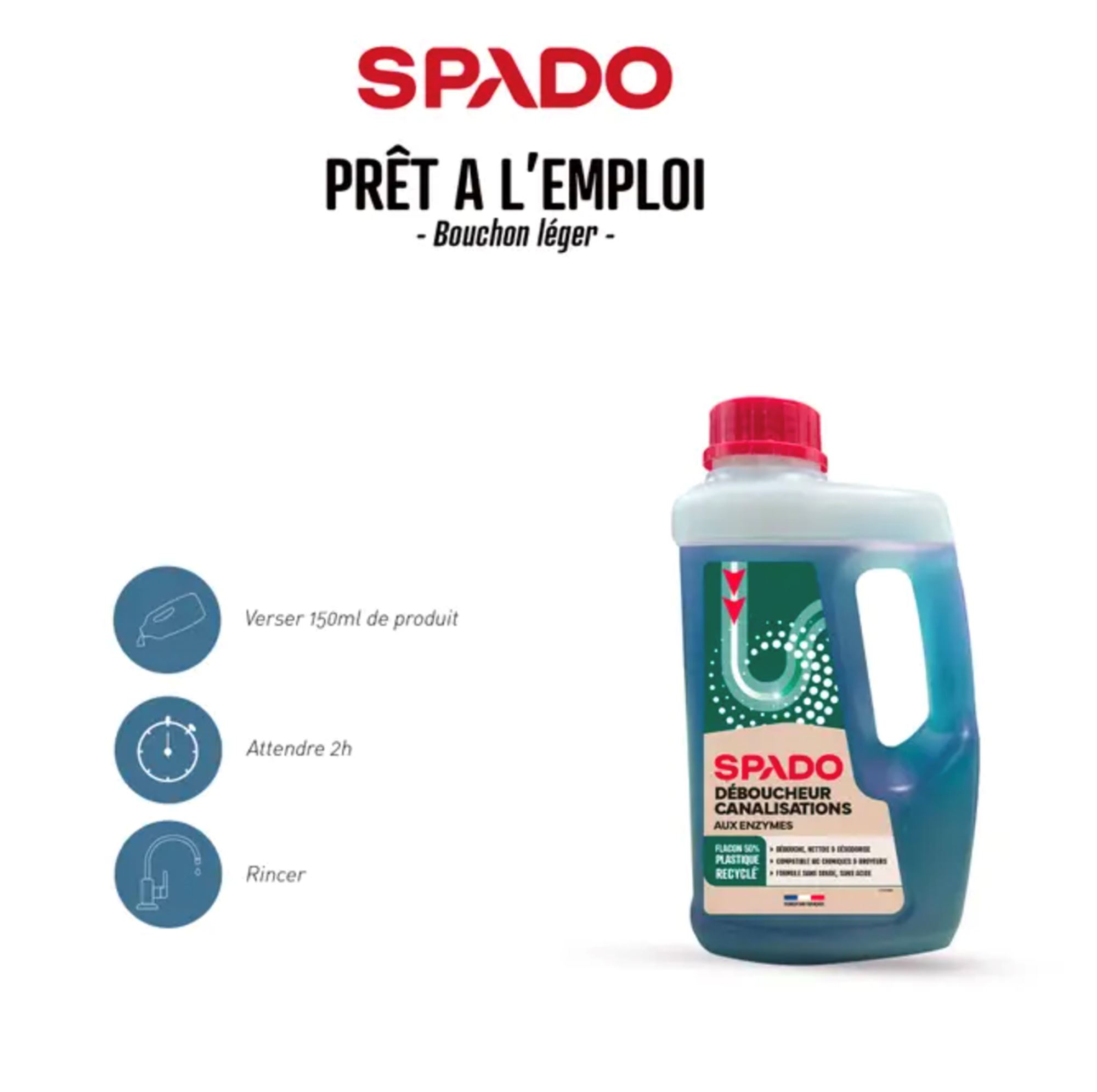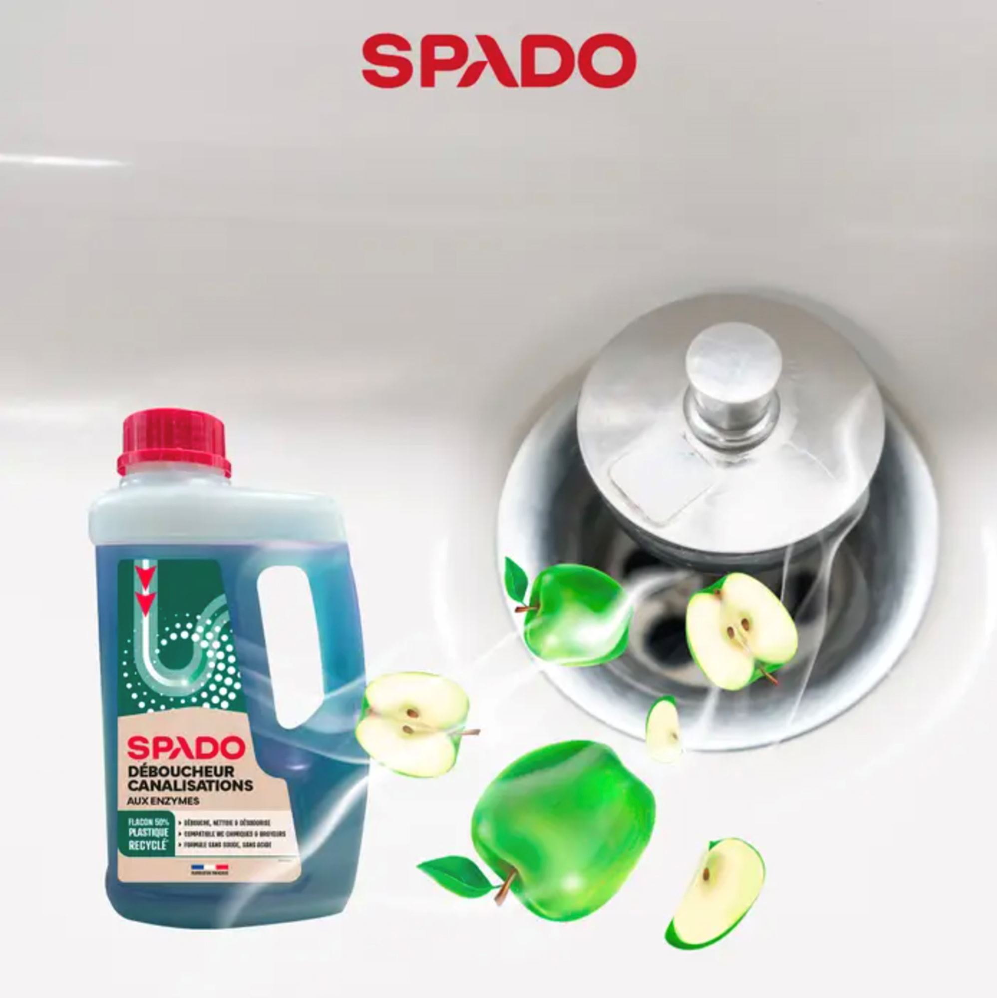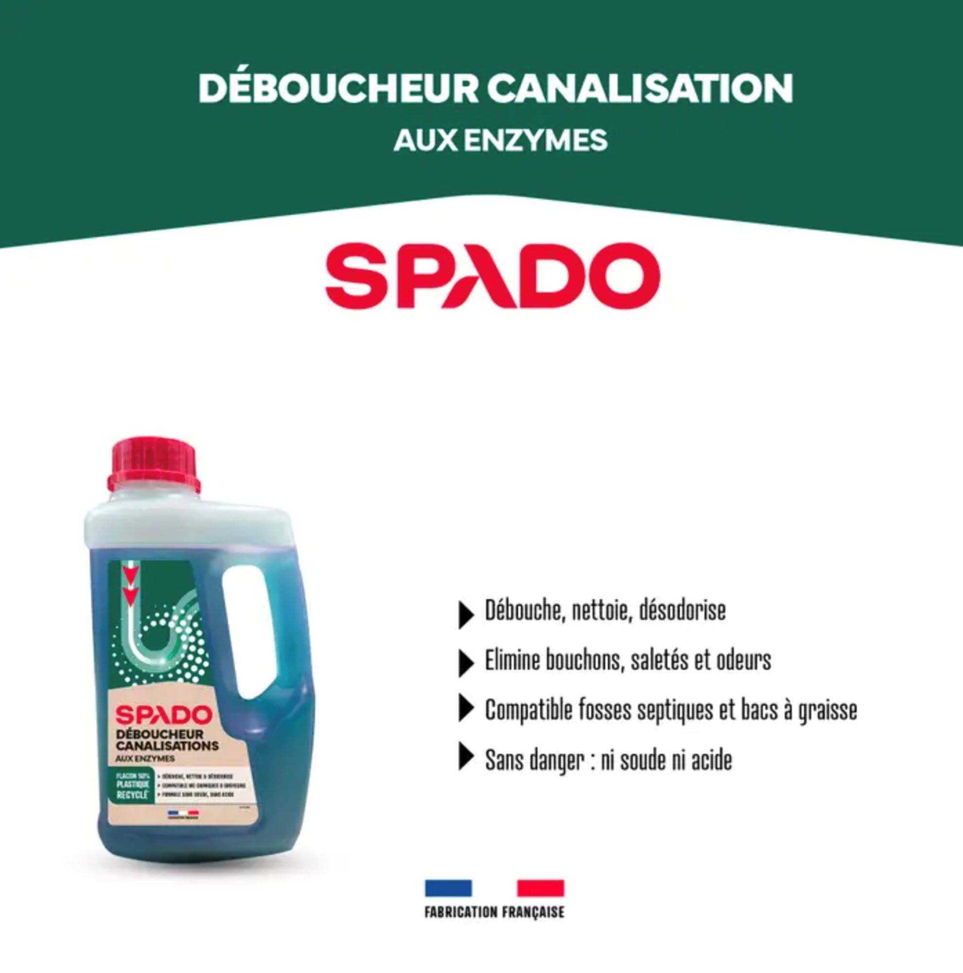 Spado bio déboucheur et entretien canalisation débouche et désodorise les canalisations d’eaux usées et sanitaires. Il dégrade les dépôts d’origine organique.