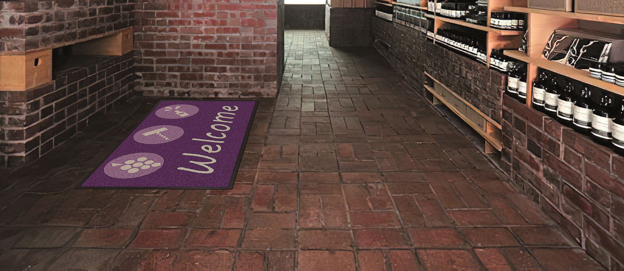 Tapis entrée logo 115x200 cm jet print. Impression haute qualité pour logo, dessins avec détails. Lavable en machine à 60°C. 66 couleurs disponibles.